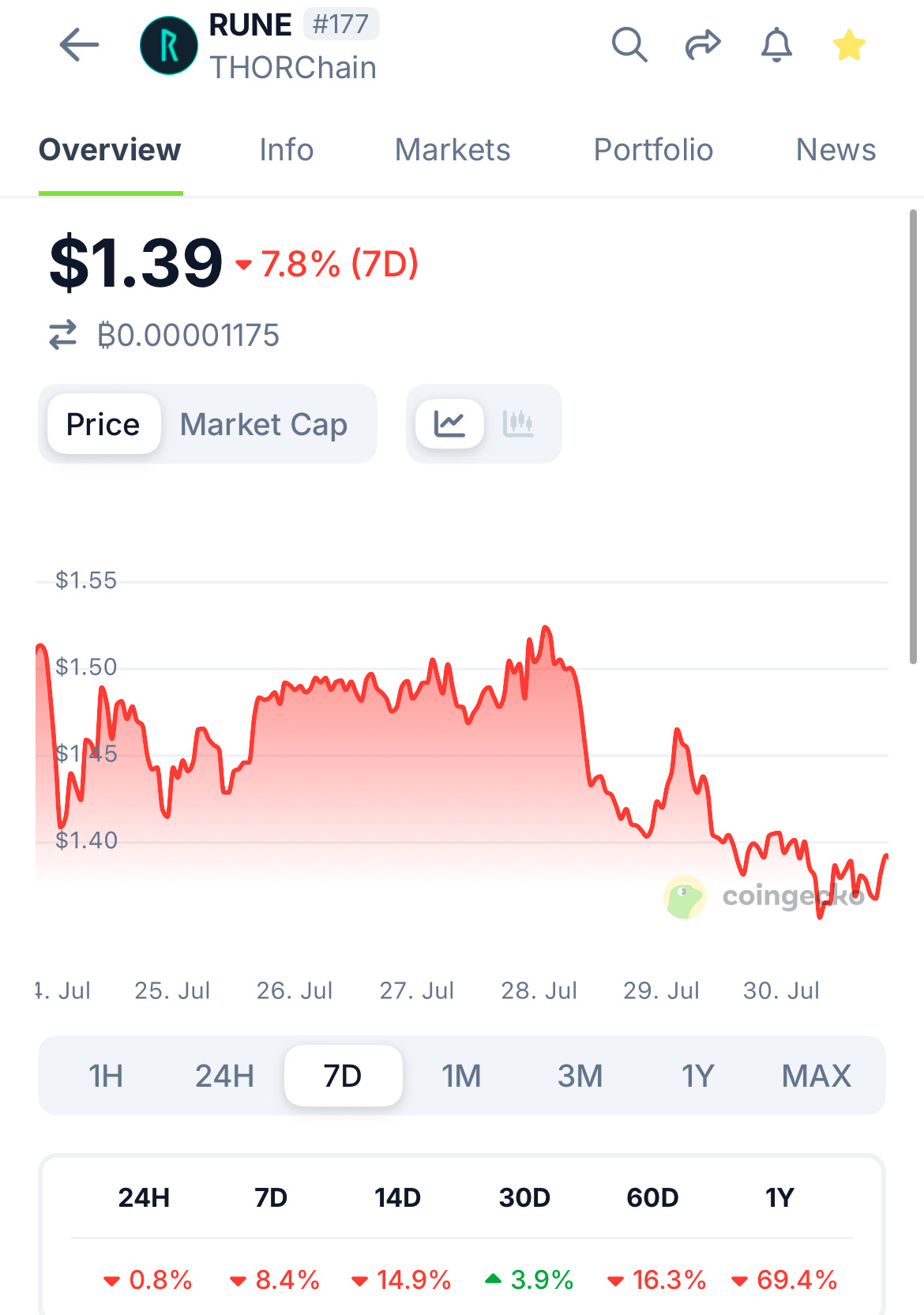THORChain (RUNE): $1.39 (▼ 7.8% 7D)