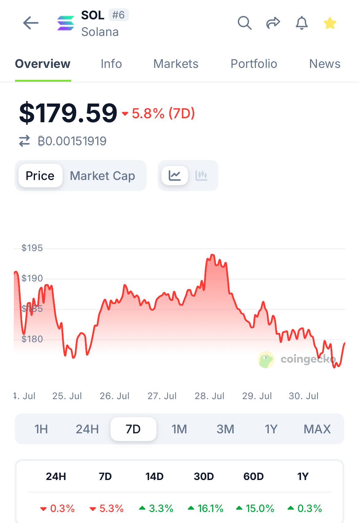Solana (SOL): $179.59 (▼ 5.8% 7D)