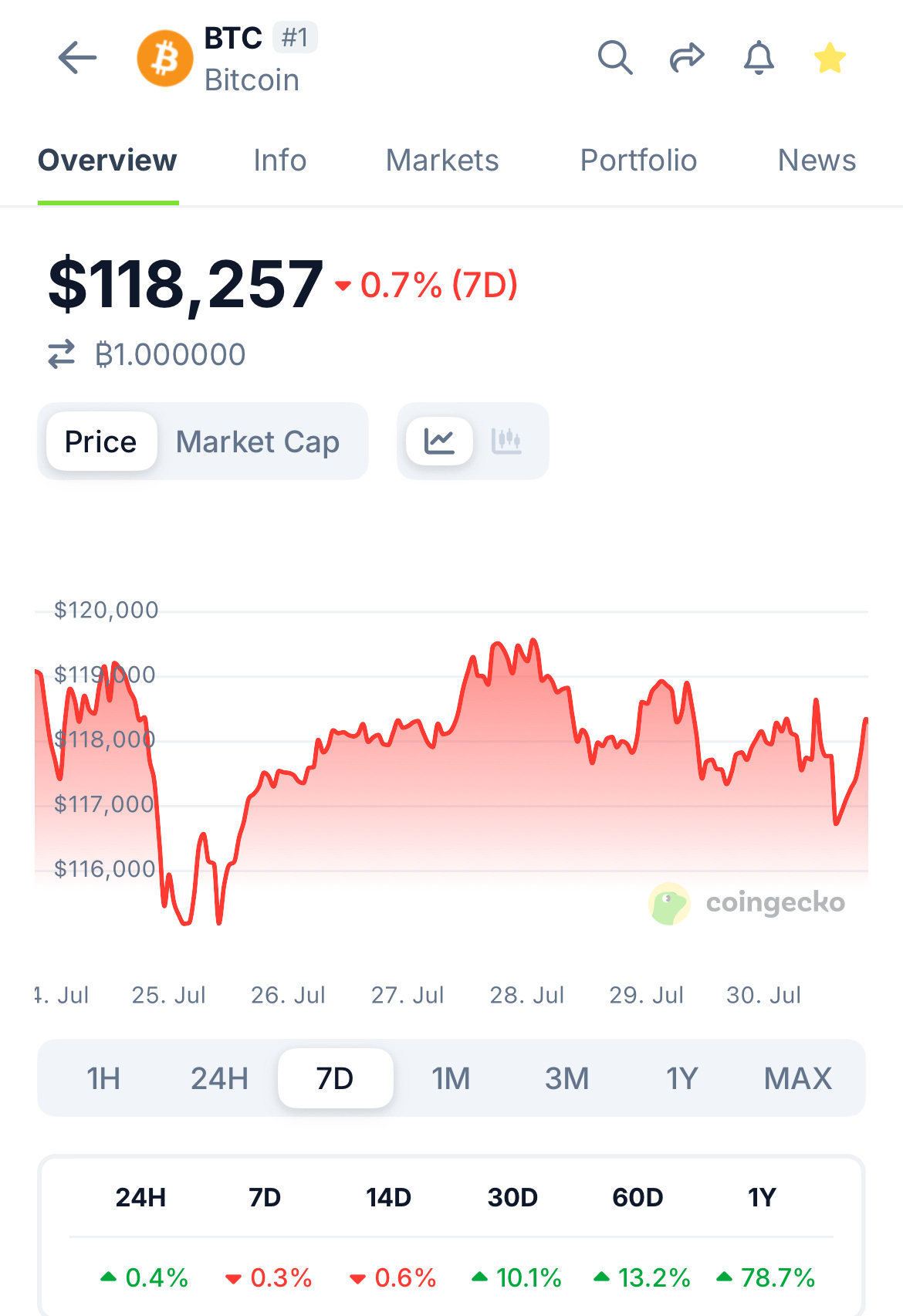 Bitcoin (BTC): $118,257 (▼ 0.7% 7D)