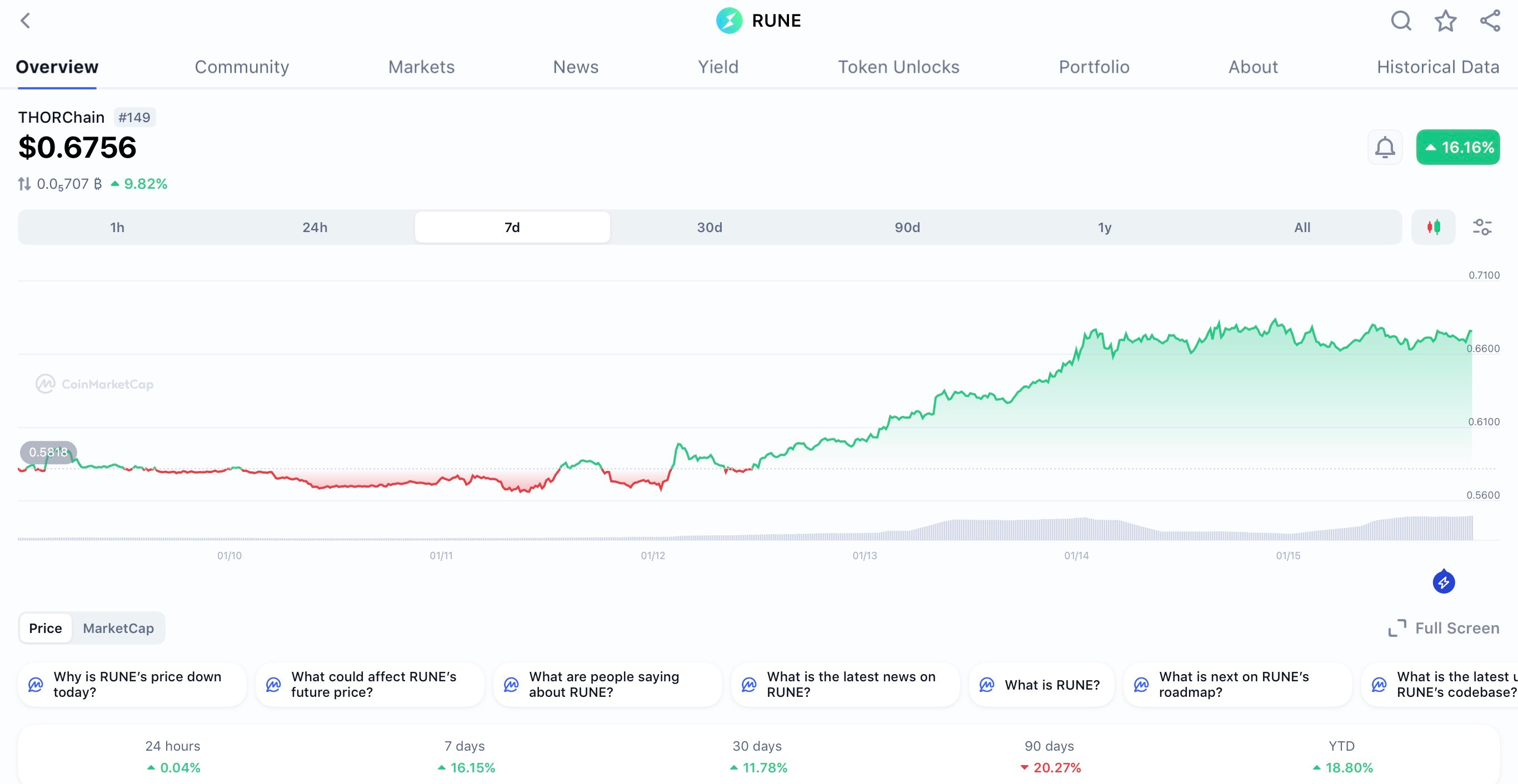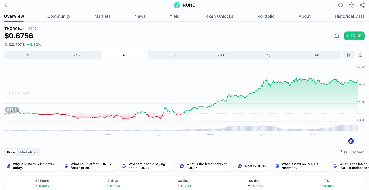 THORChain (RUNE) – Cross-Chain Survivor Sneaking Gains Jan 8: ~$0.58. Climbed to ~$0.68 highs recently on whale swaps, liquidity vibes. Jan 16: ~$0.67–$0.68 (up tiny from low, far from 2024 $5 days). 8-day vibe: +~15-16% from Jan 8 — breathing life, needs that ETF spark or big catalyst.
