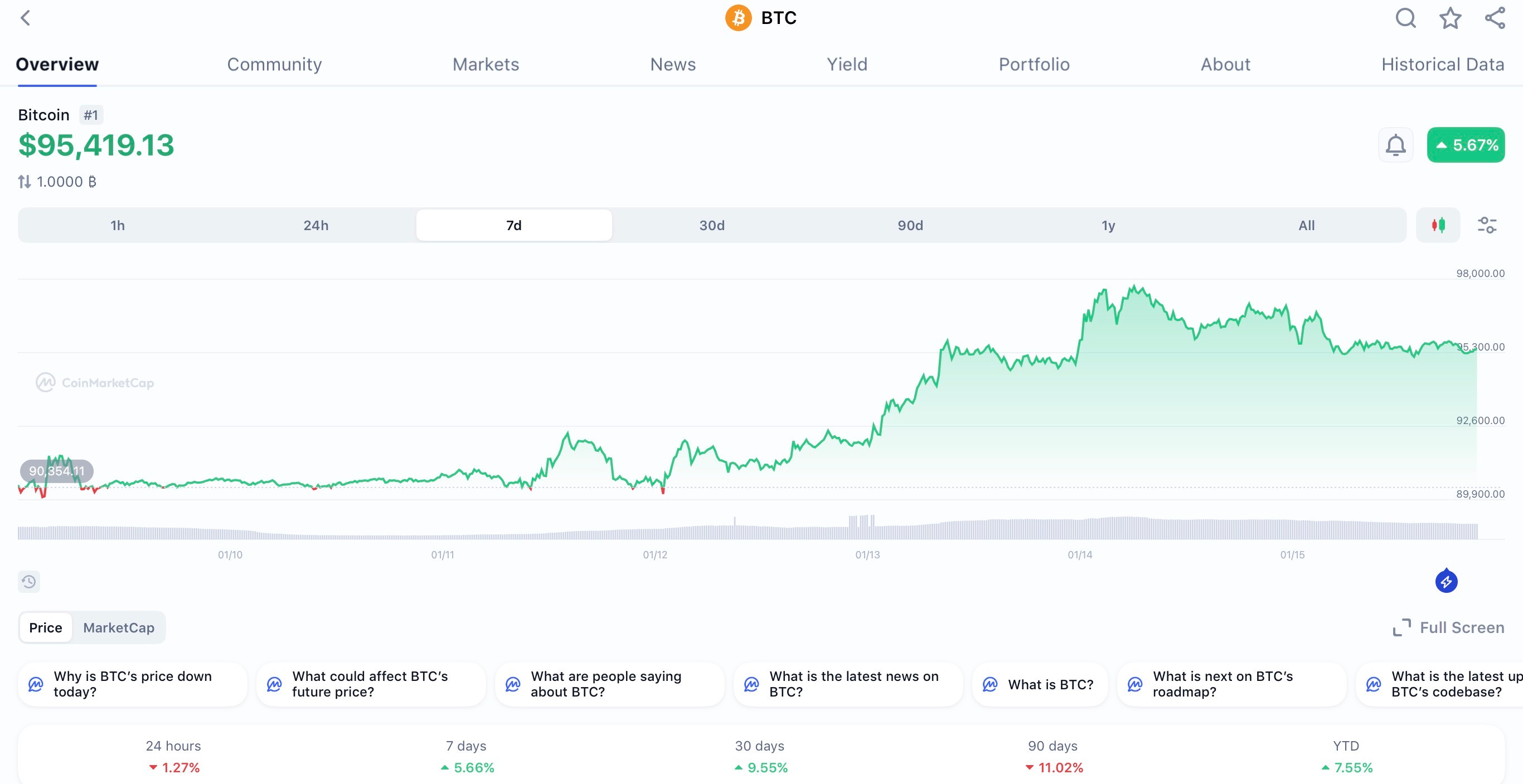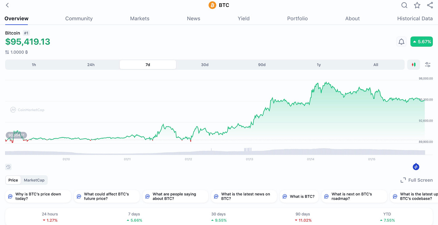 Bitcoin (BTC) – King Flirted with $97K, Then Gravity Won Jan 8: ~$91,000–$91,300 (post-crash recovery start). Peaked mid-week ~$97,000 (whales scooping, Saylor echoes). Jan 16: ~$95,500 (down ~1-2% today on Senate delays, lighter volume). 8-day vibe: +~4-5% overall from Jan 8 low, but that $97K tease had us hyped before the pullback. Still king holding the fort amid macro noise.