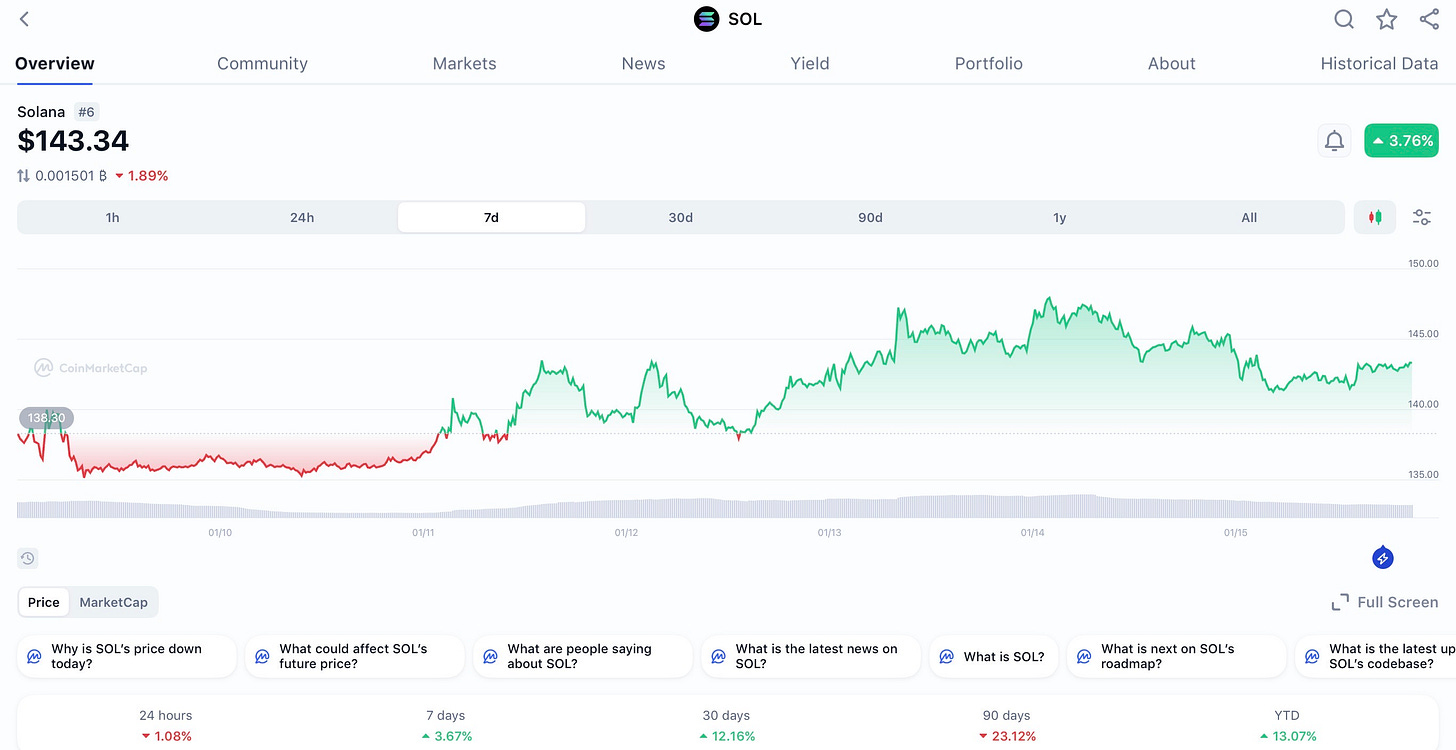 Solana (SOL) – Ecosystem Fire, Price Chilling Like a Boss Jan 8: ~$136–$138. Tested highs ~$147–$148 mid-week on stablecoin ATHs, Jupiter launches, ETF filings hype. Jan 16: ~$143 (slight dip, solid $130–$135 support). 8-day move: +~4-5%, steady rotation into DeFi/memecoins — not mooning, but shipping nonstop.