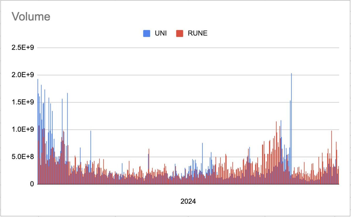 • Volume Comparisons: RUNE’s DEX volume continues to challenge UNI, despite a 5x difference in market cap. Source: AstroBoy Post.