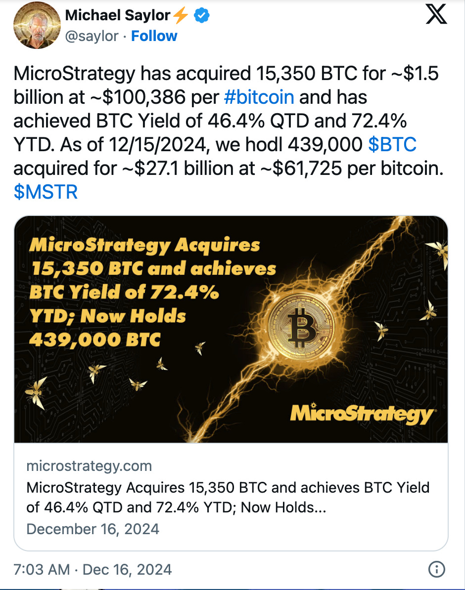 • Numbers: The company now holds 439,000 BTC, worth over $45B. The latest purchase? 15,350 BTC for $1.5 billion at an average price of $100,386/BTC.